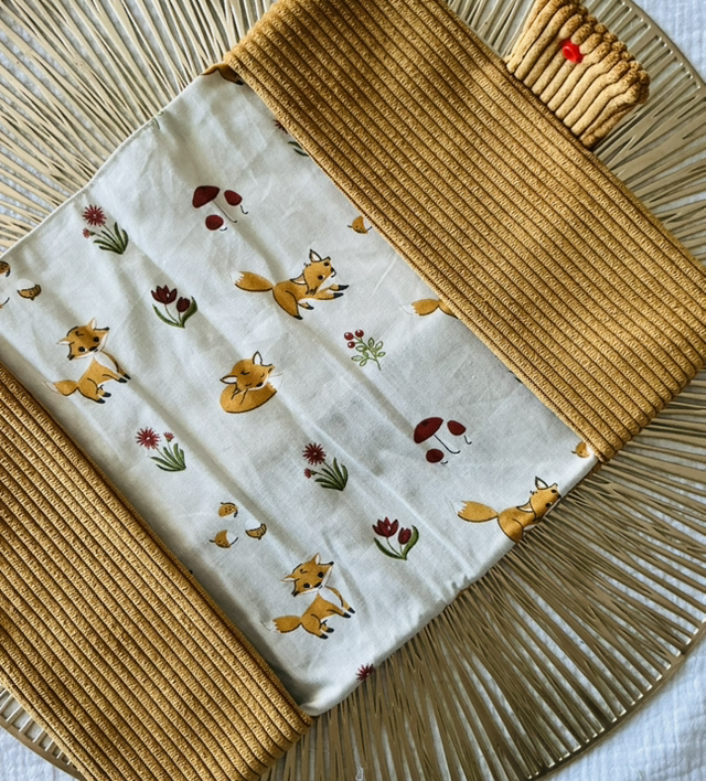 L’association du velours côtelé, chaleureux et résistant, et du coton, doux et agréable au toucher, offre un accessoire aussi joli que fonctionnel. Facile à glisser dans un sac à langer ou un sac du quotidien, il est également parfait comme cadeau de naissance.
